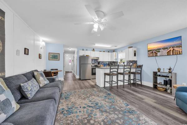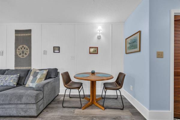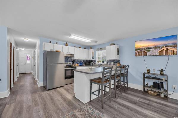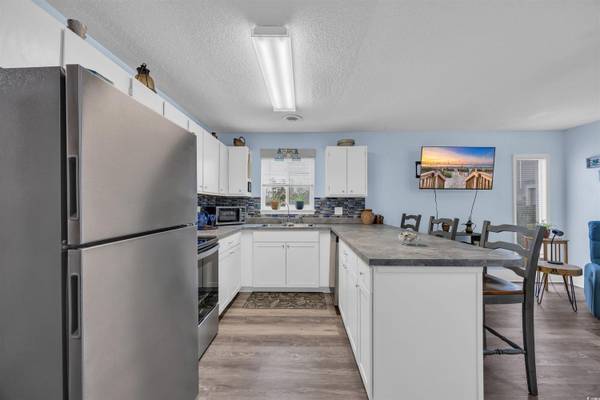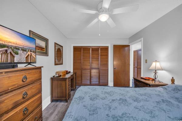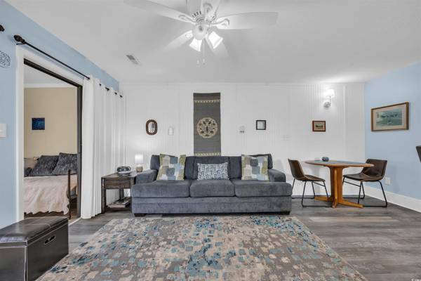 First floor. Fantastic 1 Bedroom, 1 Bath, end unit with the pool 30 steps from your back door! Walk-in shower in the remodeled full bath. The bedroom is generously sized with a large closet. Three additional hall closets provide ample storage. As an end unit there are two additional windows in the living/dining/kitchen area bringing in more natural light. Bead board on kitchen island and accent wall in living room, which has additional insulation for sound reduction. Bathrooms have been updated with comfort level toilets, new vanities, fixtures and lighting. Kitchen has new stainless steel appliances, new lower cabinets with tile backsplash, and new countertops. Location is perfect, near HWY 9, HWY 17, HWY 31 and HWY 90. Less than five miles from North Myrtle and Cherry Grove Beaches. Across from the McCleod Hospital complex and other medical facilities. Additional items will convey with the sale including: Like-new queen sofa/sleeper and new 50 inch Vizio TV in living room, three bar stools in kitchen as well as all window coverings.