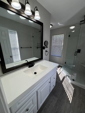 Beautiful well-maintained home in 55+ community of Woodlake Village! LVP flooring, large Carolina room with skylights, vaulted ceilings, Stainless steel appliances in kitchen, tiled shower with glass doors in master bathroom. Home is on a large corner lot on a cul-de-sac with a large side yard and beautiful front porch. Landscaping included!