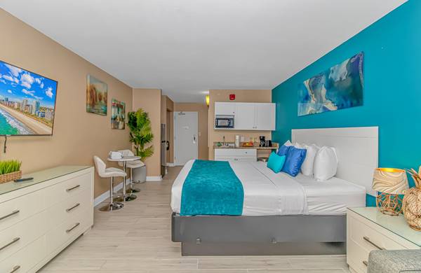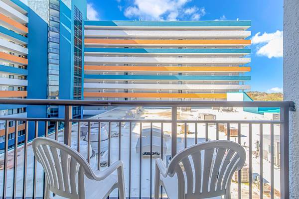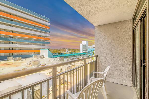 This 7th floor condo at the Landmark in Myrtle Beach. This beautifully updated suite is fully furnished with 1 king bed and will comfortably accommodate 2 guests. As of Spring 2023, this vacation rental has been updated with new paint, new modern furniture, new lvp flooring throughout, and new modern decor. Our guests enjoy having their own private balcony where they can relax and enjoy the fresh air and views of the interior courtyard.