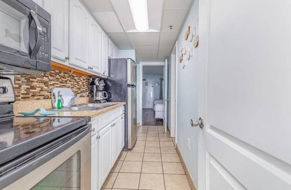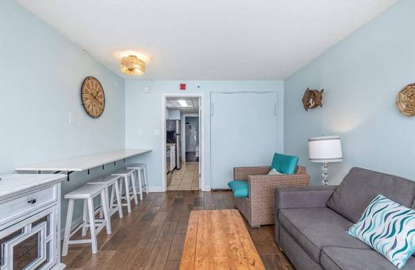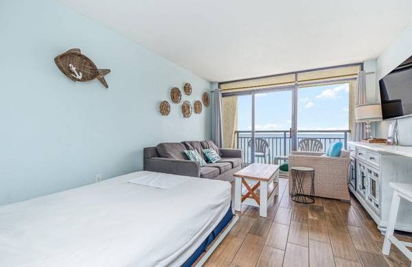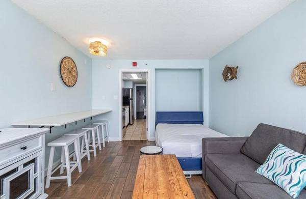 Are you looking for a cozy 1 bedroom condo with impeccable views? Check out this direct oceanfront unit at the Monterey Bay Resort in Myrtle Beach, SC. This rental is fully furnished with everything you need for your next stay and features 2 queen sized beds, 1 full-size murphy bed, 1 full size sleeper sofa, and will comfortably accommodate 8 guests. The bedroom area is located upon entry and features 2 queen sized beds, a nightstand between the beds, a window for natural light, a closet and dresser for storage, a wall mounted TV, and beautiful colors and beachy accents throughout.