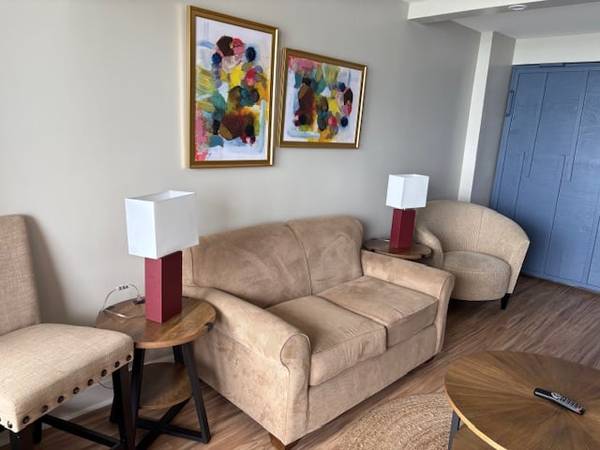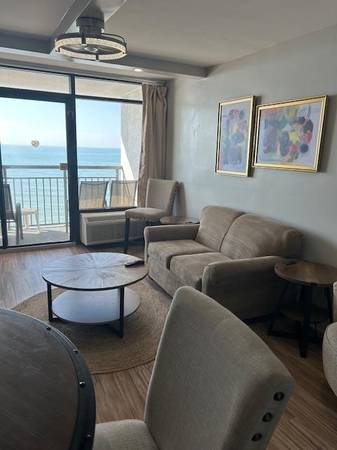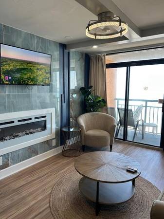 Welcome to this breathtaking 1 bedroom, 1 bathroom luxury condo located on the 10th floor with sweeping views of the Atlantic. Every detail of this residence has been completely reimagined with luxury in mind, creating an exquisite retreat that comfortably accommodates up to six guests. A large, mounted TV and sleek electric fireplace, full-size Murphy bed in the living room with 2 full sized beds in the bedroom.