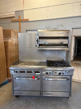 Southbend kitchen range, 2 standard ovens, 36" griddle , salamander & 4 burners. Good shape. 60" wide, set up now for natural gas. I have the shelf for it that goes left of the salamander. Great...