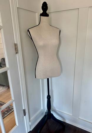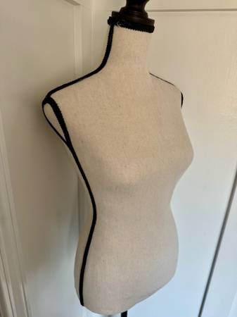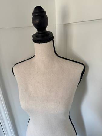 Adjustable dress form mannequin with black trim.