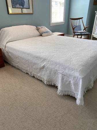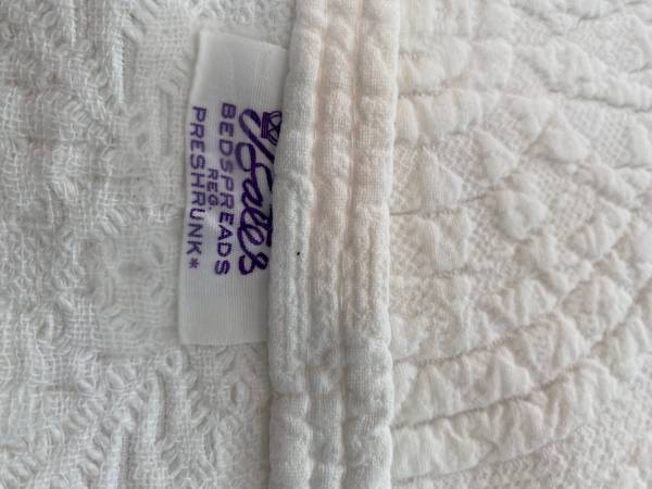 Talked with staff at the Maine Bates store and sent these photos for more information. Was told this bedspread was made between 1962-1969 (could tell by the crown on the label), and is a tight weave with double knotted fringe. Was also told a new spread today like this is $210, but is much thinner and not double knotted.