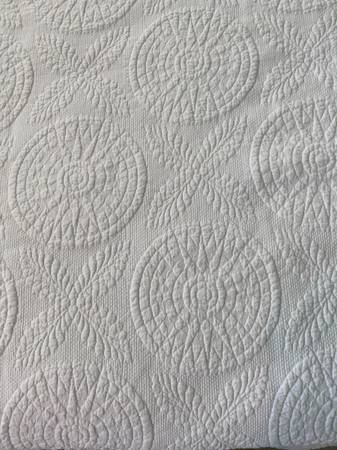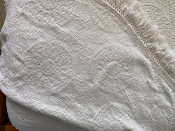Vintage Bates medallion/leaf Trapunto white fringed bedspread.