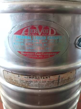Hi, I have a Really Pristine, almost brand new Antique AerVoid Model 804 5 gallon stainless steel cooler made by Johnsons in Boston, MA. This is in Pristine almost museum quality and the piece truly is in one of a kind almost mint shape. It comes with attached lid and this is all stainless and pretty heavy but that's how they made things 75 years ago. These are IMPOSSIBLE TO FIND in this shape and online I'm seeing $280 plus shipping on used and $788.89 for a new one from the company, the same model and it's super close to the condition of my item. Truly should be displayed, all metal decals are there and everything is great. For this you could probably get $400-$500 I mean it's perfect. Anyway, I'm located in the Pawleys Island/ Murrells Inlet area and can arrange to meet at a public place of your choice! Please contact John at show contact info