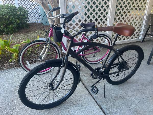 We are moving and selling our 2 beach cruisers, 7 speeds, 26” wheels, lightweight frames, no rust, good tires, ridden regularly. Kent Del Rio ladies and Bayshore men’s. Just $80 buys both!