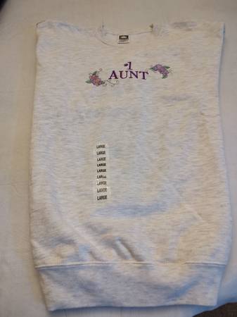 #1 AUNT Sweatshirt-NEW w. Tag. Size Large, runs Large. A very light Gray. Label still on. Smoke free home. Really nice sweatshirt! Cash and carry. Calabash for P/U, or can meet in surrounding area. (NMB,etc.)