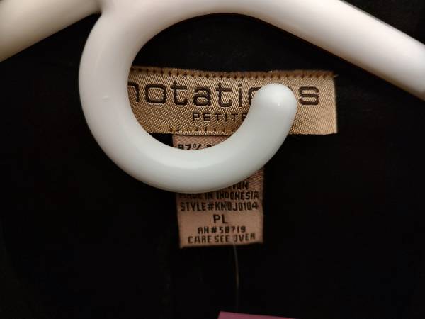 Notations Brand Ladies Black Velvet Jacket - Embroidered. Size Petite Large.. Nearly New, in Great Condition, no stains, no wear. No Flaws. Stored in closet under cover, in smoke free/pet free home. Machine Washable. Lined Jacket Front.