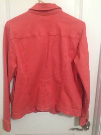 Ladies Large coral colored denim jacket by charter club in good condition no rips no tears no stains from a smoke free home $20 17 inches shoulder to shoulder