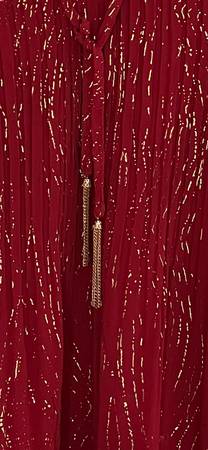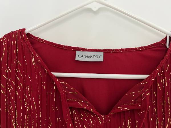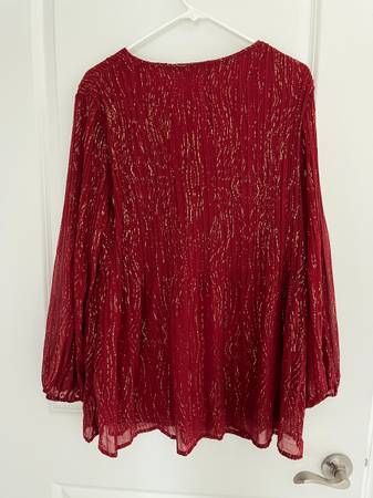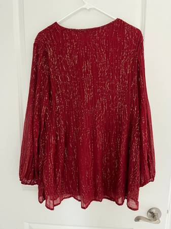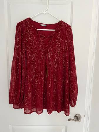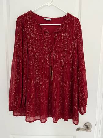This is a barely worn ladies 1X shirt. It's a redish color. See photo's The tag with size and material was taken off because it itched. It is machine washable. Very pretty, has tossels with gold...