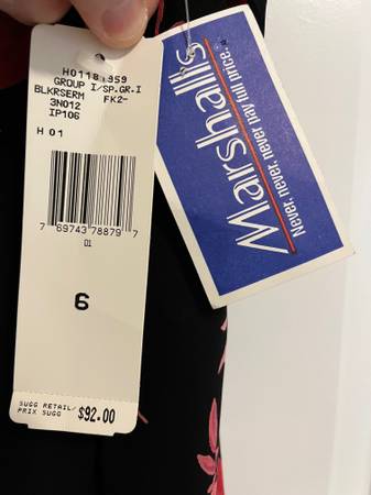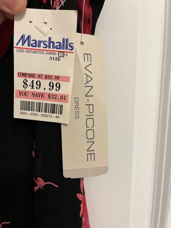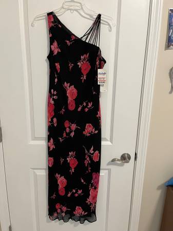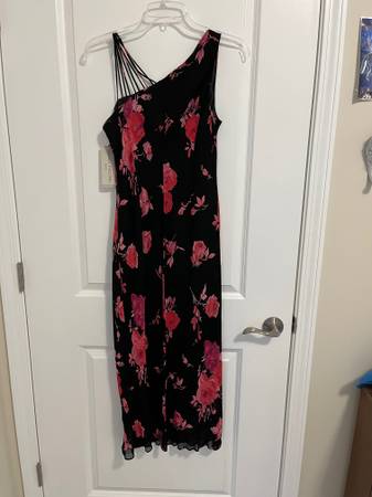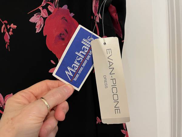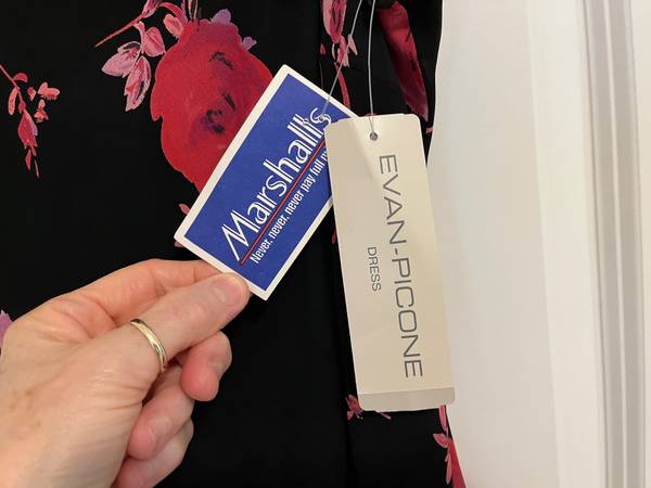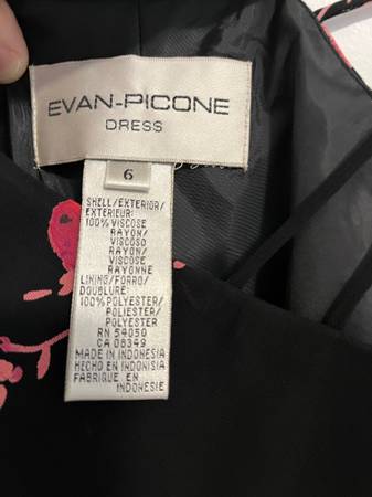This is a beautiful never worn ladies dress. New with tags - Size 6 Evan - Picone Black with Dark Pink - see Photos Exterior - Viscone Rayon Lining - 100% Polyester Made in Indonesia If interested...