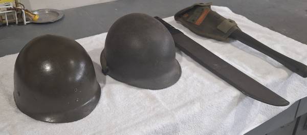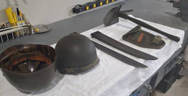 1. U.S. WW2 HELMET AND LINER. 2. U.S. ARMY MACHETE. 3. U.S. SPADE SHOVEL WITH PICK AND SHEATH. EXCELLENT CONDITION.