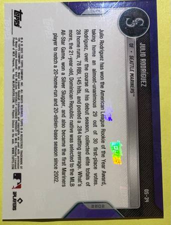 Topps Now Julio Rodriguez Rookie Cards 3 Different cards - $12 Each - Rookie of the Year - 25/25 Season - 20/20 Season Each card is in mint condition and stored in a plastic case and includes the...