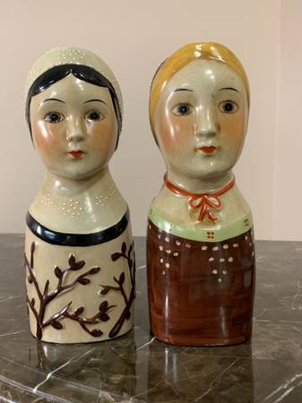 Two Sisters vintage style vases are just the loveliest ladies! Only sold as a pair, these hand painted porcelain girls have been with me for near 25 years but look just as fresh as the day they arrived. They have never been used as vases but as decor amidst my other whimsical antiques. These two ladies are ready to dance out the door to a new home.