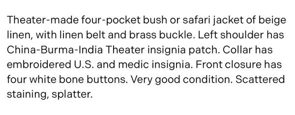 Very nice condition theater made officers tropical bush jacket from the China Burma India (CBI) theater during WW2.