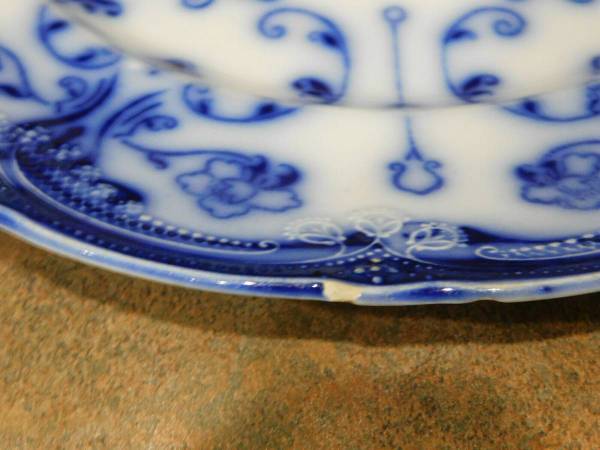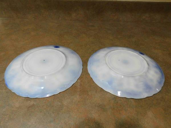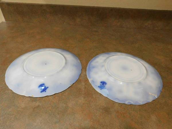 Two antique English flow blue china plates that were made by New Wharf Pottery. It is decorated with the CONWAY pattern. It is marked on the back with an under glaze blue printed mark. They measure approximately ten inches in diameter. The condition is only fair due to some "flea bites" on back and chips on edges (see photo of what I think was the most visible one Also there is what I assume are scratches on front due to utensil usage.