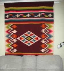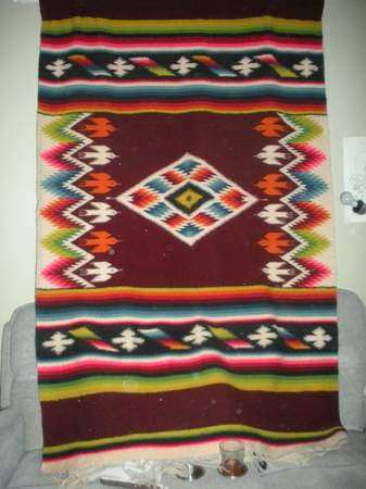 multi-colored, fringed rug made by Aztec Indians in Mexico. I have had it since 1972. Size is 4ft, 4inches wide x 7 feet long. Shown draped over the couch to show its size. (Has been a wall hanging only for most years--seldom walked on.) Dry clean or vacuum. Serious offers will be considered. Shipping/handling is extra.