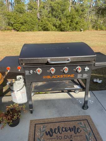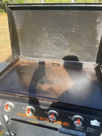 well used good condition/36” blackstone griddle with lid and outdoor cover works perfect well seasoned some rust propane tank not included
