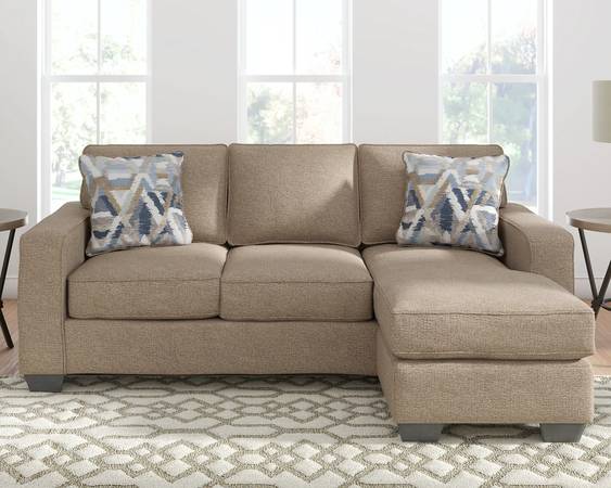 Make your living space that much more livable with this sofa chaise. You’re sure to love its L-shaped design that makes it all too enticing to kick up your heels and relax. The fact that this sofa chaise can be positioned with the chaise on the right or the left only adds to its appeal. And you can rest assured that its ultra-neutral upholstery with a textural chenille feel goes with anything and everything. Wide track armrests, box cushions and tapered feet lend a clean, contemporary aesthetic. Sectional with ottoman just $850 with free local delivery. Nobody beats our low up front prices, compare & save.