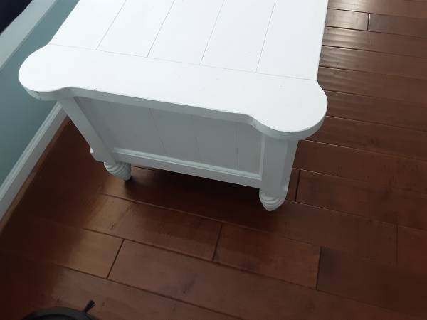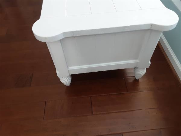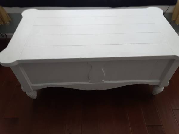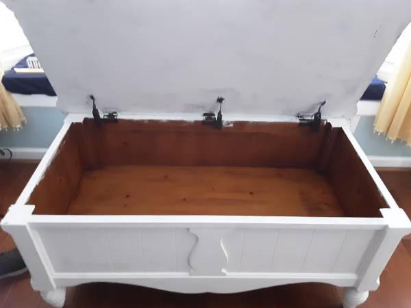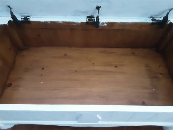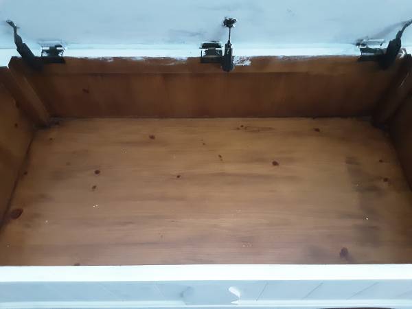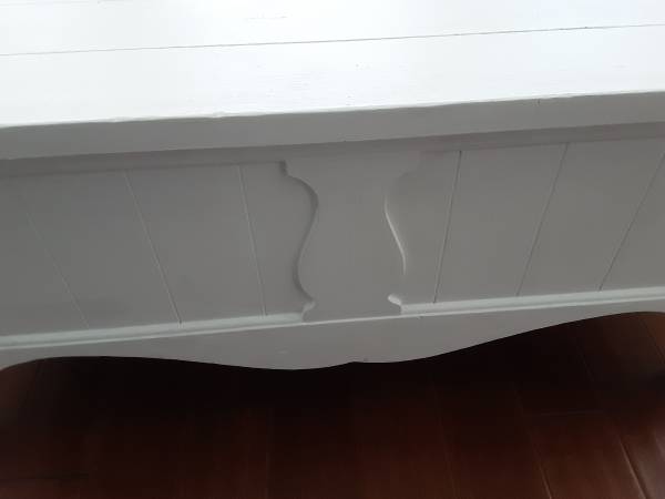 Large white painted country cottage style storage bench in great condition. 48Lx26Dx21H. Very heavy with plenty of storage space. Hinges need replaced or fixed, hence the price. Serious inquiries only please! Sorry no holds or deliveries. Located between Hwy 501 and Hwy 544 for pick up. Please bring help to pick up. Call or text show contact info