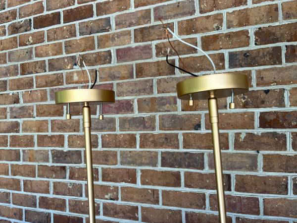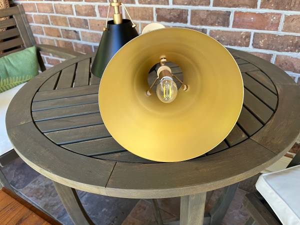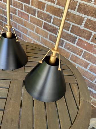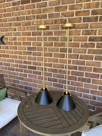 Two great brass and black pendants , perfect for kitchen bar areas. OAH 31”, shade is 5 3/4” high , 8” in diameter, one candelabra socket, canopy is 4 5/8” diameter x 1” high