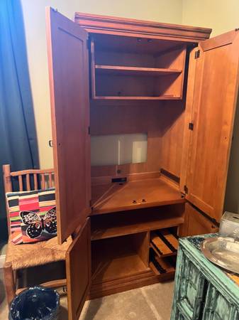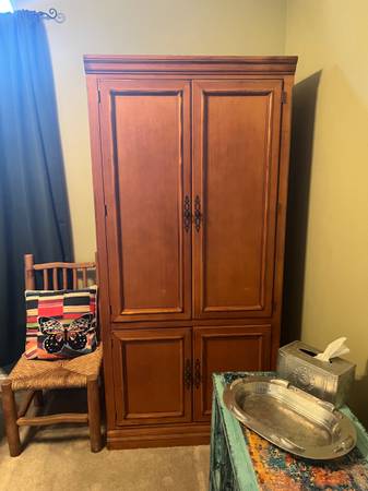 Wood Cabinet Great for storage or as an entertainment center in a bedroom. 2 bottom side draws slide out for storing smaller items. Wonderful condition! $45.00