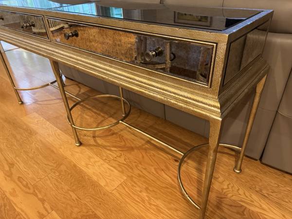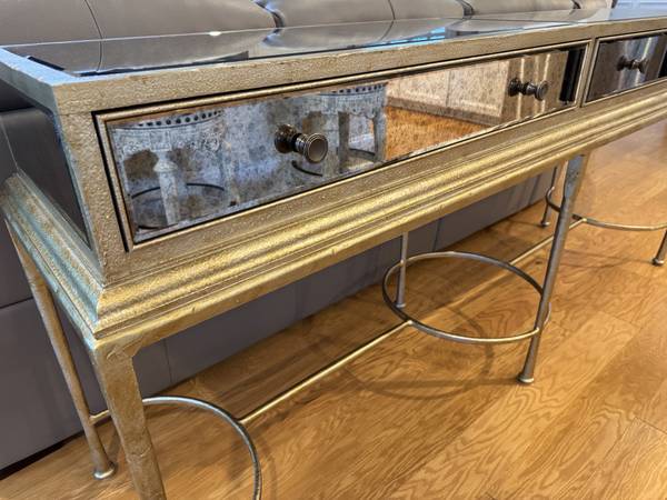 Antique mirror and gold metallic finish. In like-new condition from a smoke-free home. Measurements in inches: Height 34.25 Width: 76.50 Depth 19.50.