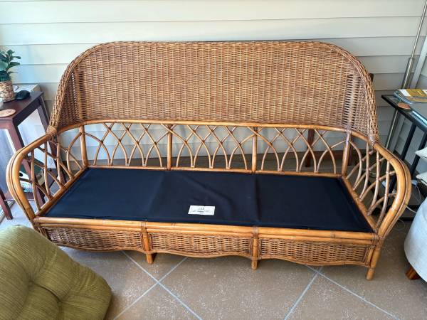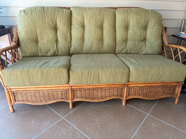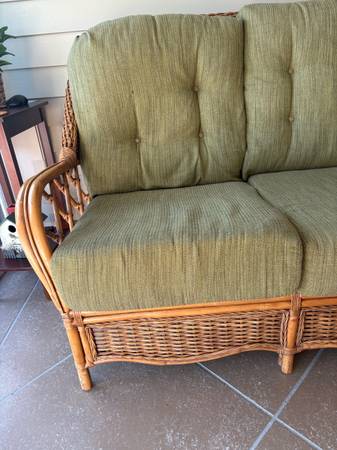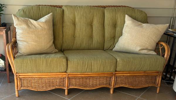 Tufted cushions provide comfortable seating and back support. This gently used piece is in very good condition and perfect for a sunroom. It has been kept inside a smoke-free and pet-free household. One cushion is missing a button. Dimensions are approximately 39 inches high, 77 inches wide, and 28 inches deep. Serious inquiries only. If this is listed, it is available.