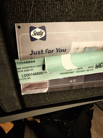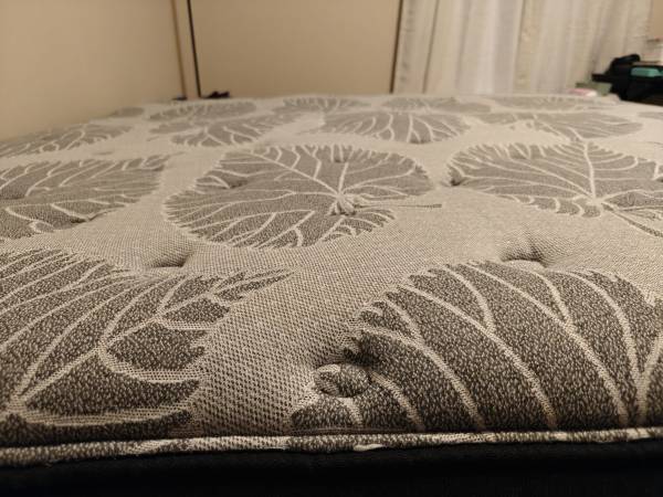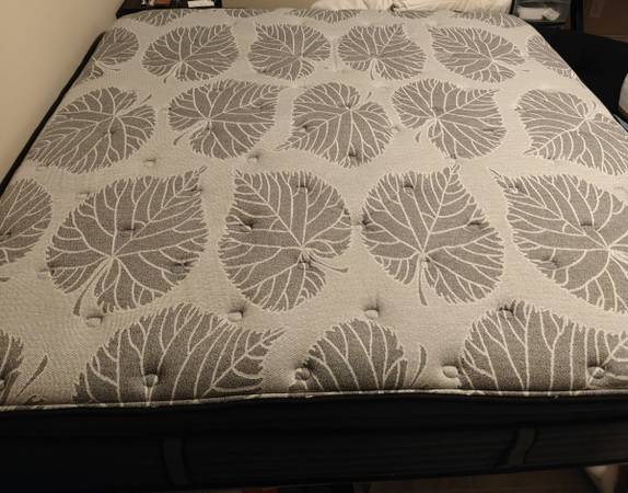 Like-new king sized Sealy pillowtop mattress. Model is Edgefield. Less than two years old. Comes with metal collapsible platform. This bed is a TRAP. Impossible to get out of, insanely comfortable. Moving and cannot take with us, I remember the mattress alone being about $1200 new. Asking $600 OR BEST OFFER, reduced from $800. MUST GO!