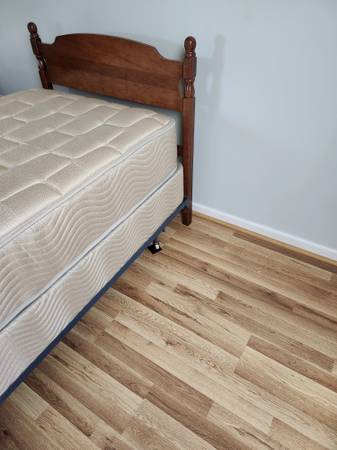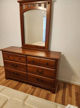 This is a twin size bed that was used for guests only. Comes with a beauty rest mattress in very good condition. Wood dresser with mirror. Includes mattress cover, 1 set of sheets and a bedspread.