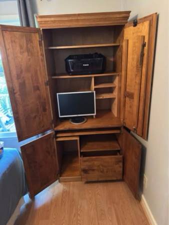 Computer desk cupboard with folding down table and drawer. Measurements: 24Dx33Wx77H. Must bring a truck to pick it up and two or three people cause it’s very heavy. Asking $100 OBO