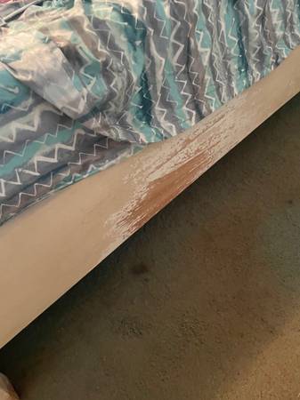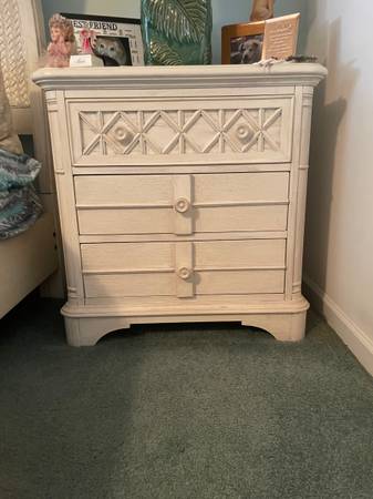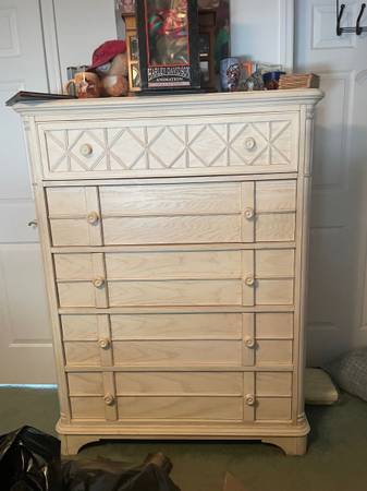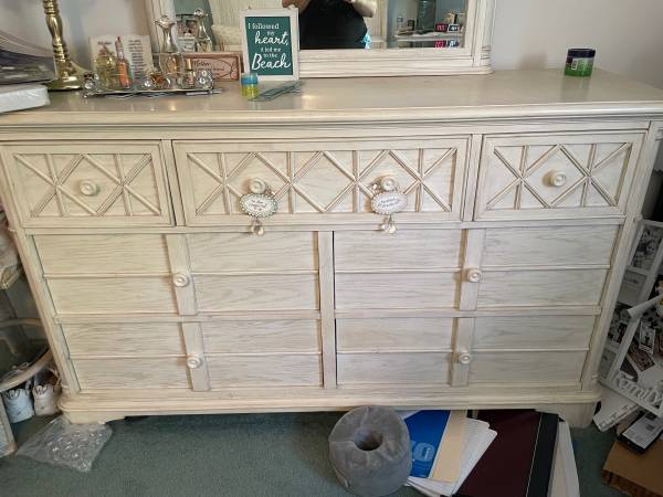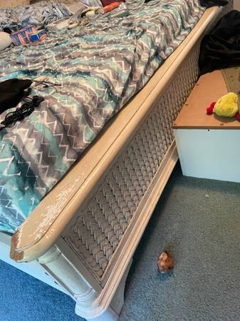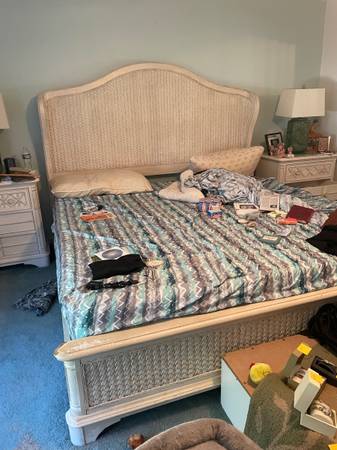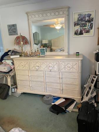 Two side tables King size bed frame and headboard Tall dresser Long dresser with mirror (Bed frame has some superficial damage)