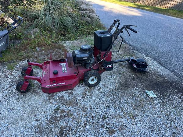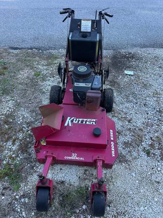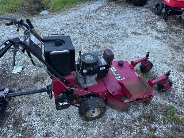 This walk behind mower is an absolute beast. Cosmetically has some surface rust but the machine alone runs great. Needs nothing other than a pin for the sulky stand on. All the pin does is connect the stand on to the machine. (I have a screwdriver in its place now so you can see)