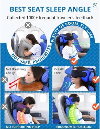 Up for sale is a slightly used Travel Pillow Airplane Pillow with 3D Eye Mask for Sleeping, 360° Support Plane Head Strap, Long Flights Essentials. This was my daughters' that she bought and used once on a long trip. In perfect condition.