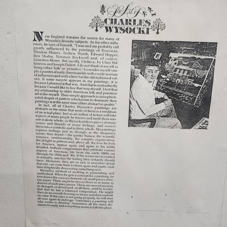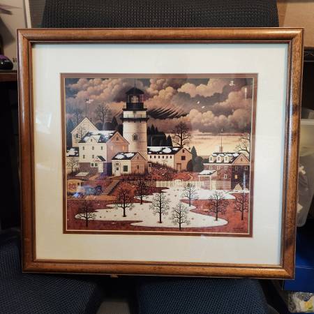 Twilight Sentinel" by Charles Wysocki. Framed print depicts a winter scene in a quaint, coastal New England. Measures 17x15. Wysocki's work is known for its Americana themes and folk art style. Vintage. Frame is in good shape with a few scuffs and dings that have been touched up. Looks very nice. $30. Cash only. Can meet near downtown Conway. No holds. I don't give out my phone. Email or CL app only