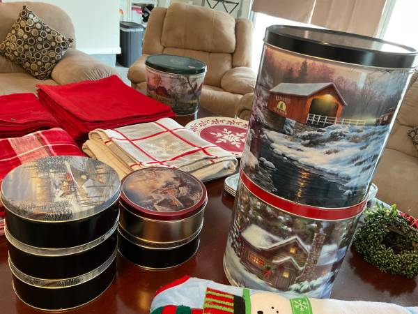 Three large Christmas table clothes, 16 placemats- red cloth, 2 platters, 7 Christmas tins, large tree skirt, tin Christmas LEGO set