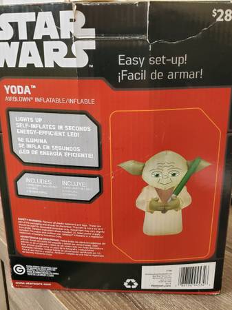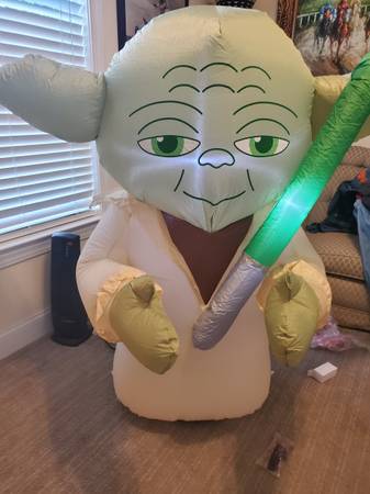 Up for sale is slightly used a 2015 Star Wars Yoda Blow Up/Inflatable 4 1/2 FT High Lawn Decoration. Yoda Inflates up great. He lights up and he self inflates in seconds.