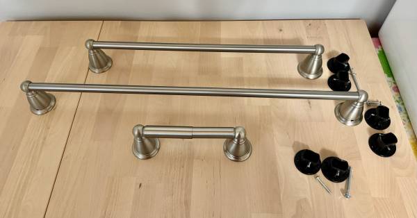 Bathroom Hardware: 18” and 24” towel bars + Toilet Paper Holder — From new construction home LOT of 3 Brushed Nickel bathroom hardware for $12: * 18” towel bar * 24” towel bar * Toilet paper holder...