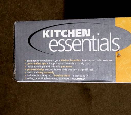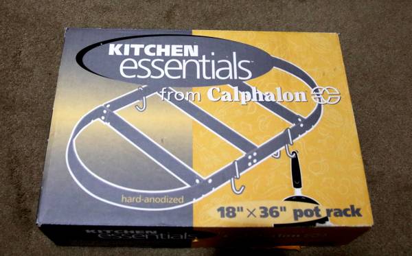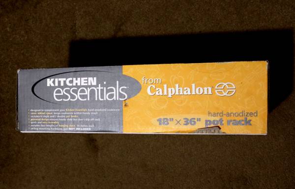 For sale is a new, never used, Calphalon 18” x 36” hard anodized hanging pot rack. Still in the original packing.