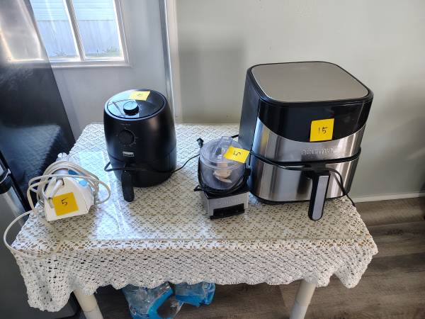 Housewares, lawn mower, glassware, hand made coffee table, 2 gaming chairs, exercise bike, foot massager, bedroom furniture and more!