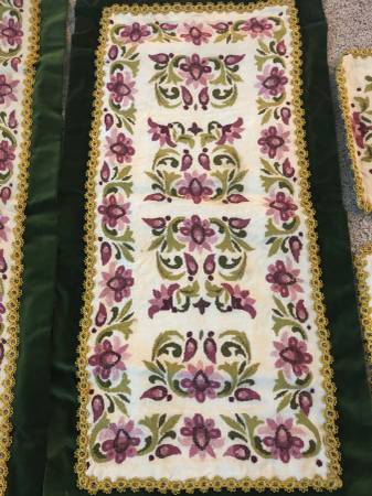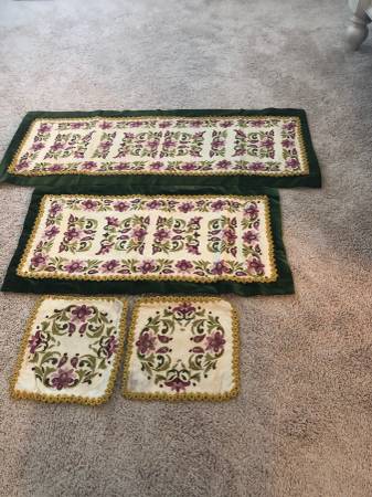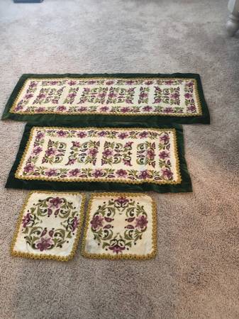 One of a kind cross stitched Aubusson Hand made 4 pieceTable Runners, table toppers, placemats for dining tables, coffee tables, end tables etc.