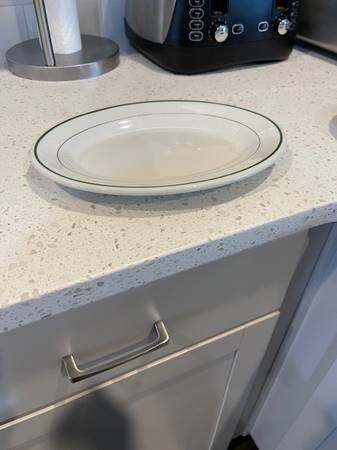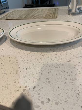 2 Oval Plates: flat white with green trim oval.