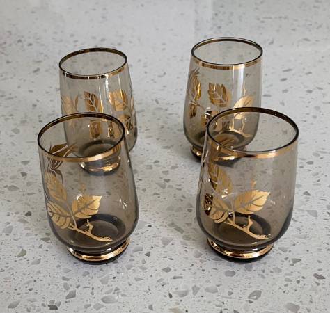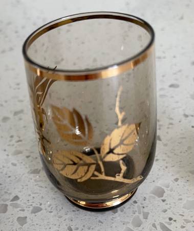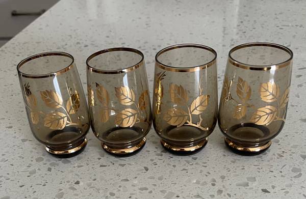 Set of 4 Beautiful one of a king Cognac-shot glasses With beautiful design. Amber color. Gold trim and Gold designed leaves. Must see to appreciate. Please call or text: