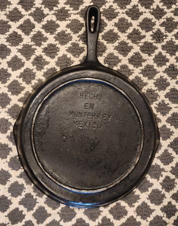Vintage/rare cast iron skillet. Stamped 'hecho en Mexico - Monterey NL'. Measures 8" inside bottom.