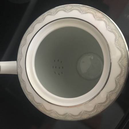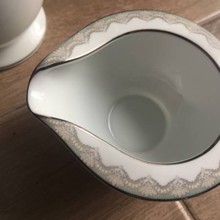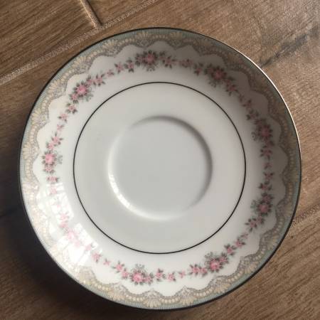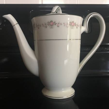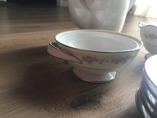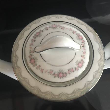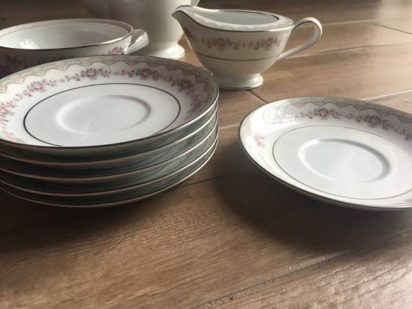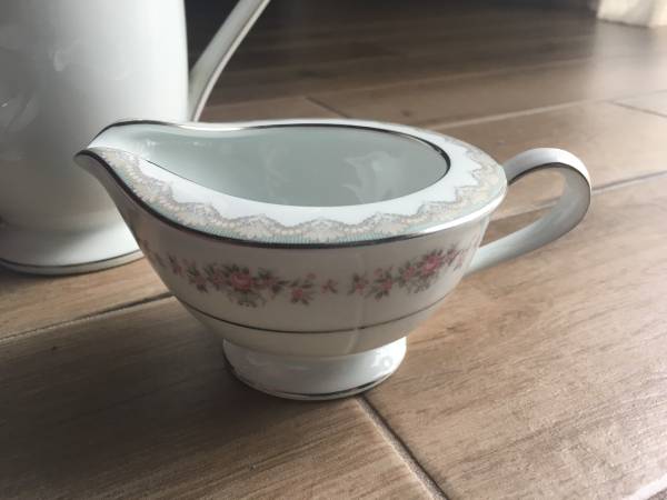 Includes: - Coffee pot with lid - Creamer - Sugar bowl MISSING lid - 6 saucers Pattern: Pink roses & leaves on the border and a grey & tan pattern on the edge, with platinum trim. Everything...