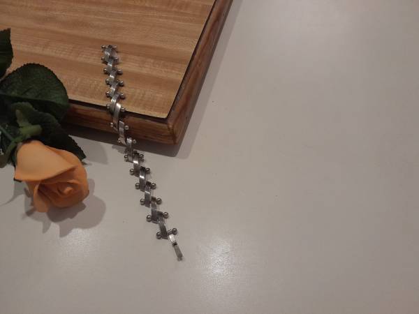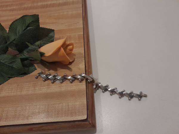 The Vintage Mexico Modernist Sterling Silver Heavy Bar Link Bracelet is a stunning piece of jewelry that showcasess intricatecraftsmanship and a unique design. Made from 925 sterling silver, this bracelet features a fold-over clasp closure and measures 7.5 inches in length. The modernist style and art-inspired theme make it a timeless accessory that adds beauty to any outfit. Perfect for those who appreciate fine jewelry and vintage pieces with a touch of elegance and charm.