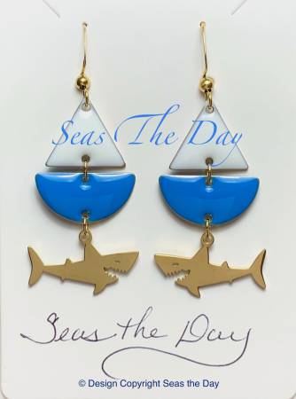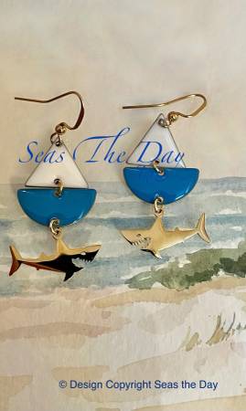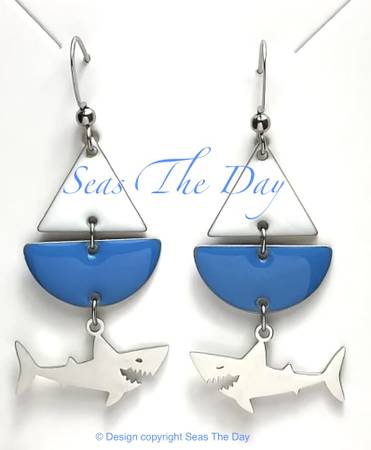 Shown in this listing the silver stainless ear wires and shark. Additional photos of the gold version of these earrings. These earrings have great movement and shine when the light hits the sharks. Metals are so hard to photograph. Truly fun earrings from my original design.