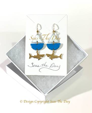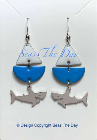 These one of a kind hand made and personally designed pair of Fin-tastic earrings are sure to be catch of the day! Ear wires are stainless steel for those of you with metal allergies. These earrings measure 2 1/4” from top of the ear wire to the bottom of the shark and are 3/4” wide. The perfect nautical dangle that will have this “ Nauty” shark swimming towards compliments and giggles on how cute they are. Supplies are limited in case your friends and family gotta snag a pair for themselves.
