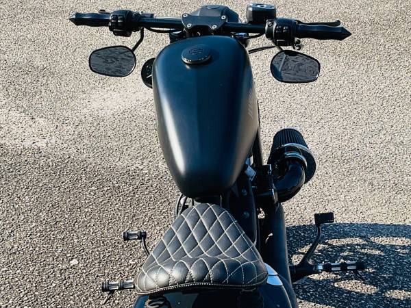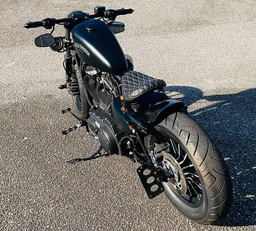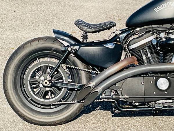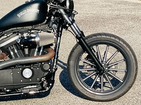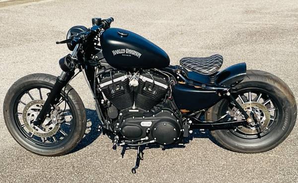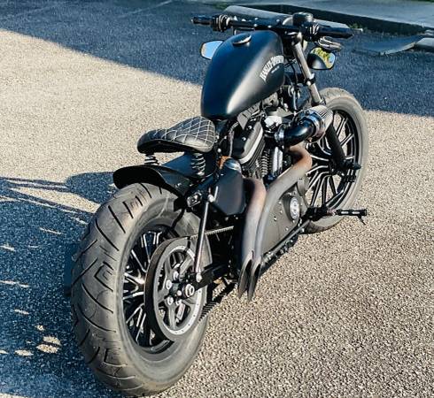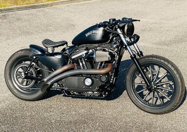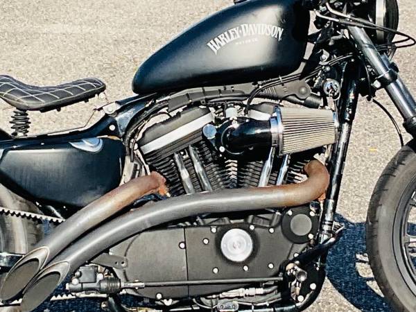 Super cool Sportster Iron that’s been chopped into a bobber, drag bars with custom grips, solo seat, rear struts, new tires, 883cc engine, 5 speed transmission, custom exhaust system, fun to ride!